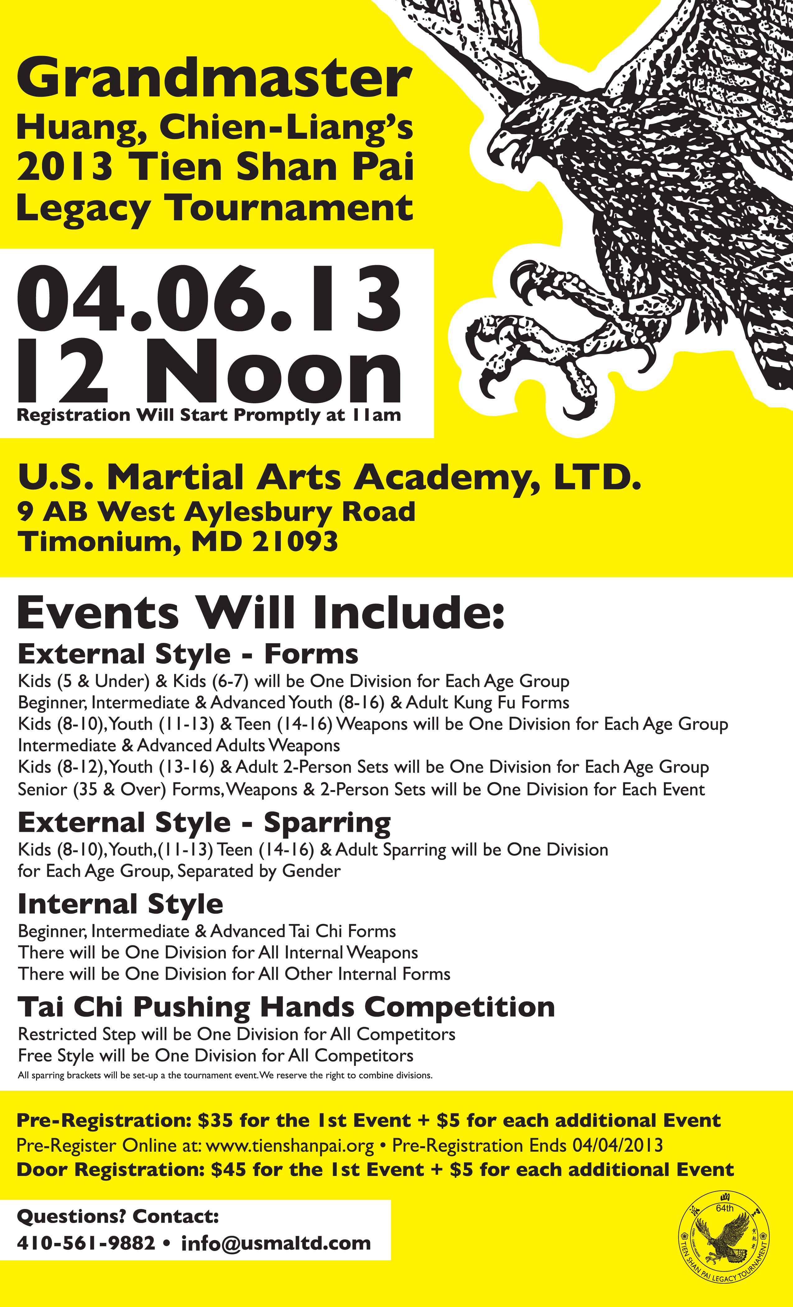 On Saturday, April 6, 2013, U.S. Martial Arts Academy, Ltd. will host Grandmaster Huang’s 2013 Tien Shan Pai Legacy Tournament. We will not have the regular Saturday class schedule this day as we will have already set up the competition areas after Friday’s classes.