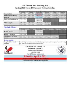 This is the US Martial Arts Academy, Ltd.’s Covid-19 Spring 2021 schedule for all Kung Fu and Tai Chi classes. Our Kung Fu and Tai Chi training will help improve focus, fitness, flexibility, balance, self-discipline, self-esteem, strength, coordination and memory.